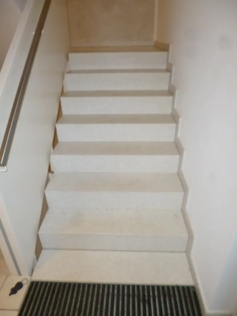 Im Neubauprojekt an der Tonstraße in Essen wurde ein modernes Mehrfamilienhaus mit 8 hochwertigen Eigentumswohnungenrealisiert. Im Treppenhaus kam der langlebige Betonwerkstein Bianco Carrara 0/7 mit geschliffener Oberfläche zum Einsatz – ein elegantes, pflegeleichtes und zeitloses Gestaltungselement.