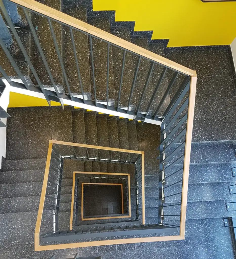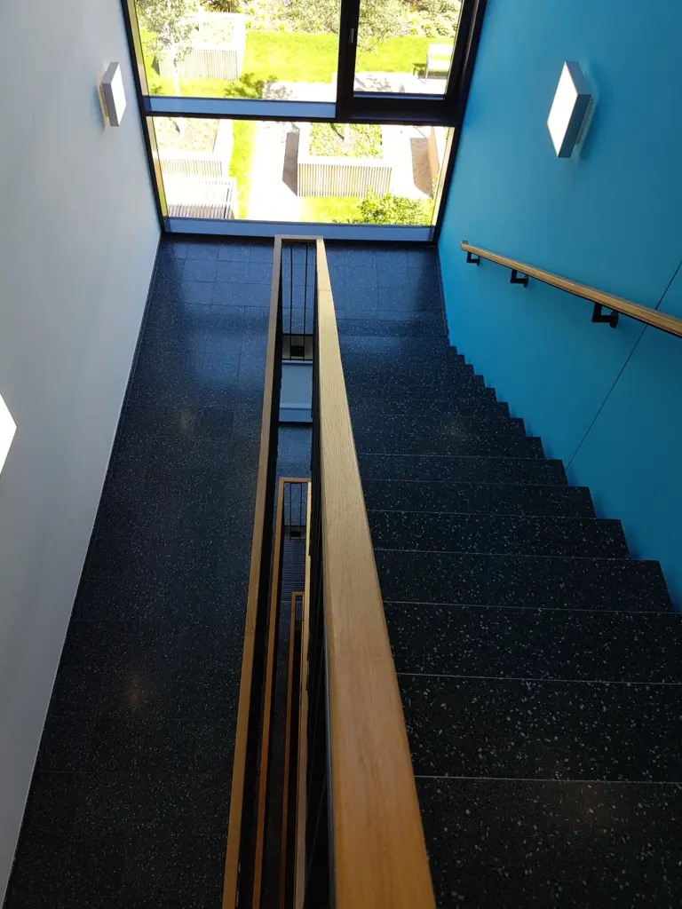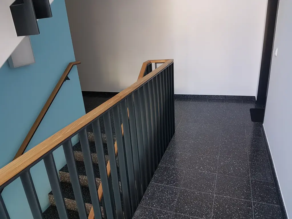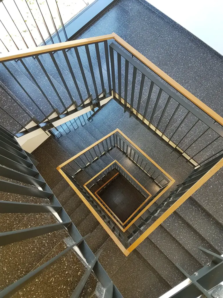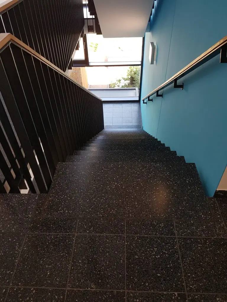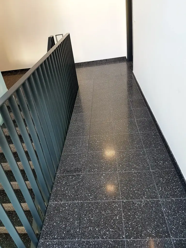 In der Gräulingerstraße in Düsseldorf wurden 12 moderne Mehrfamilienhäuser mit insgesamt 120 hochwertigen Mietwohnungen realisiert. Ein besonderer Fokus lag auf der innenarchitektonischen Gestaltung der Treppenhäuser, bei der Langlebigkeit, Funktionalität und ästhetisches Design im Vordergrund standen. Zum Einsatz kam Betonwerkstein der Fa. Euval Nr. 99.80 Nekan mit geschliffener Oberfläche R9 für Treppenhausbeläge und Aufzugstürgewände.